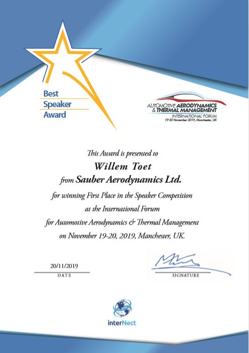 The winner for the Best Speaker Award for 2019 was Willem Toet from Sauber Aerodynamics Ltd. with his presentations on Thermodynamics in Motorsport & Evolution, Strengths & Limits of Wind Tunnel Testing.
